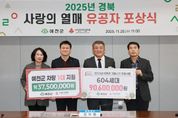 영남연합포커스 김진우 기자 | 예천군은 26일 오전, 경북사회복지공동모금회(회장 전우헌)가 주최하는 ‘2025 경상북도 찾아가는 이웃돕기 유공자 포상식’이 예천군청에서 열렸다고 밝혔다. 이번 행사는 희망 2025 나눔캠페인과 나눔 및 선행문화 확산에 기여한 개인 및 나눔봉사단의 공로를 기리고 격려하기 위해 마련됐다. 이날 행사에서 나눔·봉사를 실천한 공로로 사회복지공동모금회장 표창에 학가산 전통메주마을 박상지 대표, 기부와 선행을 실천한 공로로 경북도지사표창에 해인종합상사 황지훈 대표, 최우수 봉사단에 예천군 사랑의열매 나눔봉사단이 선정됐다. 아울러 봉사단 활동에 활발히 참여해 준 김종순 사무국장과 박승용 단원에 사회복지공동모금회장 표창을 수여했다. 예천군 사랑의열매 나눔봉사단은 ‘희망2025나눔캠페인’에서 약 5억 8천만 원의 이웃돕기 성금을 모금했으며, 착한가게 영입, 나눔리더 발굴 등 따뜻한 나눔문화 확산에 앞장선 결과 2년 연속 최우수 봉사단으로 선정될 수 있었다. 경북사회복지공동모금회 손병일 사무처장은 “한해 동안 열심히 활동 해 주신 예천군 사랑의 열매 나눔봉사단에 감사드리며, 내년에도
