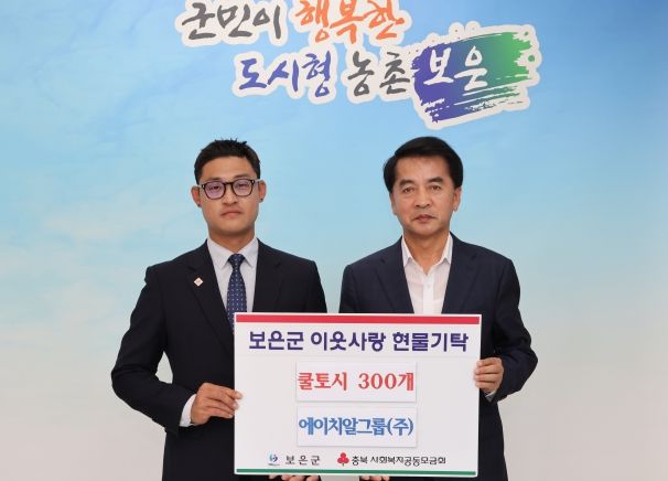 영남연합포커스 김진우 기자 | 경기도 김포시 소재 에이치알그룹은 22일 보은군청을 방문해 무더위 취약계층을 위해 써 달라며 쿨토시 300개를 기탁했다.