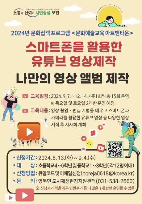 영남연합포커스 김진우 기자 | 포천시는 오는 9월 7일부터 12월 14일까지 영북면 도시재생현장지원센터와 포천미디어센터에서 아동·청소년을 대상으로 2024년 문화집객 프로그램 '문화예술교육 아트앤타운'을 운영한다.