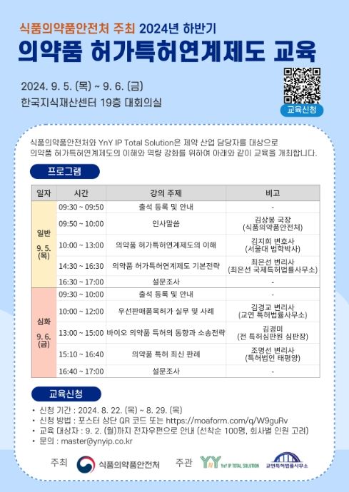 영남연합포커스 김진우 기자 | 식품의약품안전처는 제약기업 등 관련 업계 담당자들을 대상으로 ‘2024년 하반기 의약품 허가특허연계제도 교육’을 한국지식재산센터 대회의실(서울시 강남구 소재)에서 진행한다고 밝혔다.