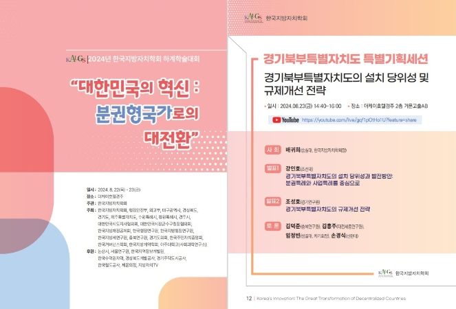 이번 학술대회는 한국지방자치학회 하계학술대회 기간(22일~24일) 가운데 열리는 특별기획세션으로 경기도와 한국지방자치학회가 경기북부특별자치도를 주제로 공동 개최한다. 경기북부특별자치도 설치 추진을 위한 민간 중심의 공론화를 실현하고 학계 전문가 등에 대한 정책 공감대를 확산하기 위해 마련됐다.