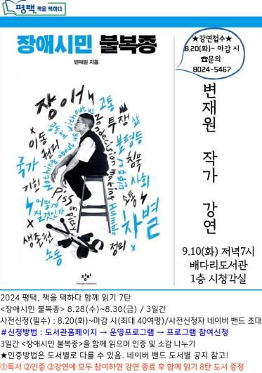 영남연합포커스 김진우 기자 | 평택시 배다리도서관은 '장애시민 불복종' 변재원 작가 강연을 다음 달 9월 10일 화요일 저녁 7시 1층 시청각실에서 진행한다.