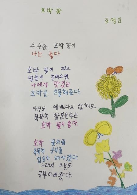 엽서 부문에서는 ▲경기도교육감상에 강칠성 어르신(학교에 오니 좋다, 76세, 부천시오정노인복지관) ▲경기도의회의장상에 이영옥 어르신(아들에게, 73세, 범안종합사회복지관) 등 20명이 수상의 영광을 누렸다.