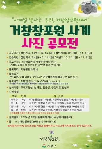 하반기 접수는 10월 21일부터 11월 8일 18시까지 이메일로 제출해야 하며, ‘거창창포원 사계절 추억의 순간’을 주제로 거창창포원을 배경으로 한 다양한 풍경 및 인물 사진을 제출하면 된다.