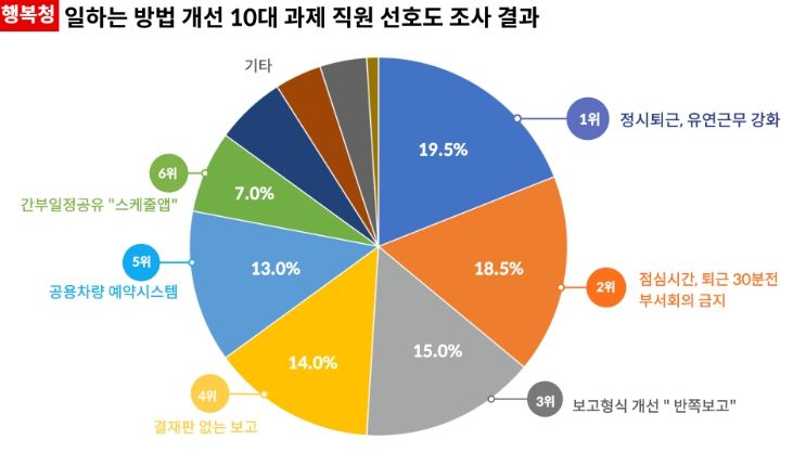 행복청은 내부직원 공모를 통해 2024년 10월부터 ▲결재판 없는 보고 ▲간단한 보고를 위한 ‘반쪽 보고’ ▲퇴근 30분 전 회의 금지 ▲정시퇴근 및 유연근무제 강화 등 ‘일하는 방법 개선 10대 과제’를 발굴하여 운영하고 있다.