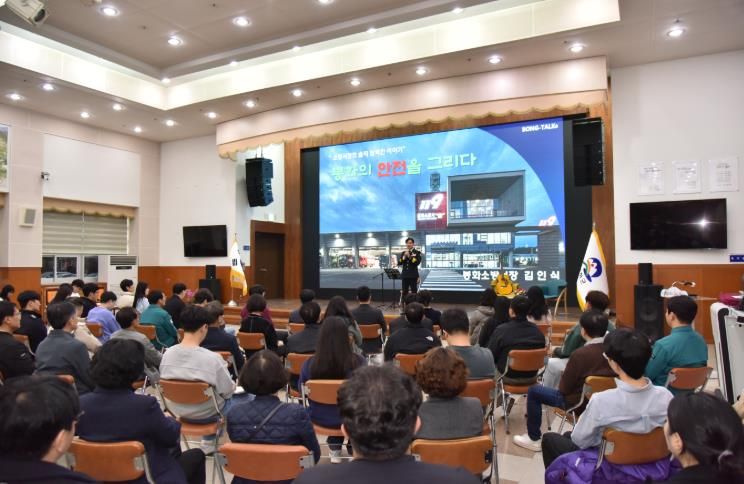 김인식 서장은 실제 출동 사례를 비롯해 소방관 구조훈련 현장사진과 영상 등을 활용하여 재난 현장의 긴박함과 봉화군만의 재난사고 특성을 생생하게 전달하고, 농기계 사고·산악구조 사고·교통사고 등 지역 현장에 특화된 안전대책을 소개하며 알차고 유익한 강의를 펼쳤다.