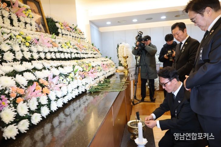 영남연합포커스 기자 | 김민석 국무총리가 27일 종로구 서울대학교병원 장례식장에서 故 이해찬 민주평통 수석부의장의 빈소를 조문하고 있다.