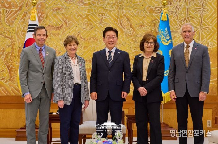 영남연합포커스 기자 | 이재명 대통령은 4월 2일 오후 청와대에서 진 섀힌(Jeanne Shaheen) 상원 외교위원회 간사 등 공화·민주 양당 의원으로 구성된 미국 상원의원 대표단을 접견했다. 이 대통령과 미 대표단은 한미동맹 및 한반도 문제를 비롯해 중동 전쟁의 안보적·경제적 파장과 대응 방안에 대해 심도 있는 의견을 교환하고, 향후 경제적 여파 대응 과정에서 한미가 긴밀히 소통해 나가는 것이 중요하다는 점에 뜻을 같이 했다.