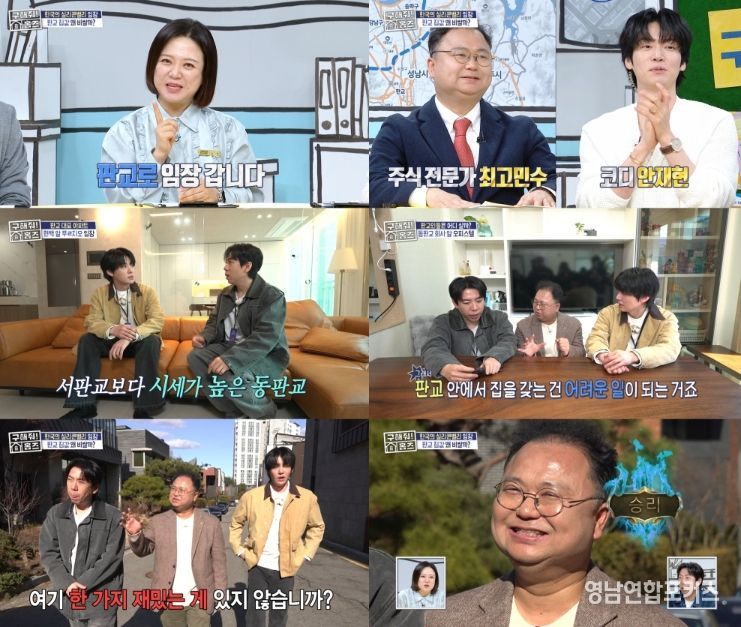 이날 방송은 ‘대한민국의 실리콘밸리’로 불리는 게임 산업의 중심지 판교 신도시를 조명하며 임장에 나섰다. 판교는 경기도 성남시 분당구에 위치한 대표적인 신도시로, IT·게임 기업들이 밀집해 있는 첨단 산업 중심지로 꼽히며 경부고속도로를 기준으로 동판교와 서판교로 구분된다. 지난 여의도 편에서의 활약으로 화제를 모은 최고민수와 배우 안재현이 게스트로 함께해 MC 양세찬과 호흡을 맞췄다.