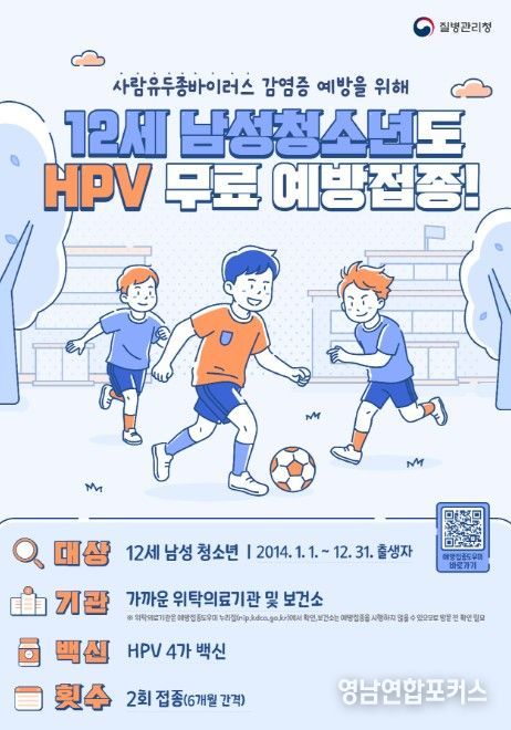 영남연합포커스 기자 | 질병관리청은 2026년 5월 6일부터 12세 남성 청소년(2014년생)을 대상으로 사람유두종바이러스(Human Papillomavirus, HPV) 백신 국가예방접종 지원사업을 새롭게 시행한다.