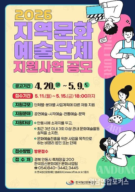 영남연합포커스 관리자 기자 | 안동시 한국정신문화재단은 5월 11일부터 5월 15일 18시까지 관내 문화예술단체를 대상으로 ‘지역문화예술단체 지원사업’ 참여단체를 공개 모집한다.