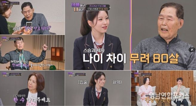 연습도 필요 없다는 아버지가 걱정이 된 딸 전수경은 “실수해서 ‘땡’하면 안 되니까 선생님을 모셨다”며 아버지와 함께 연습실로 향했다. ‘97세’ 전수경 아버지의 선생님이 될 주인공은 ‘트롯 공주’ 오유진이었다. 오유진은 쟁쟁한 어른들을 제치고 15살에 ‘미스트롯3’에서 미를 거머쥐었고, 현재 17세에 데뷔 6년 차에 들어섰다. 일일 선생님이 겨우 17살이라는 사실에 전수경 아버지는 깜짝 놀라 입을 다물지 못했다. 전수경은 “두 사람의 나이 차가 무려 80살이다”라며 너스레를 떨었다. ‘선생님’ 오유진의 나이를 들은 전수경 아버지는 “내가 17살에는 해방돼 가지고 만세만 부르고 돌아다녔다. 어른들이 깃대 들면 우리도 덩달아서 펄펄 뛰어다니며 흥으로 표현했다. 조금 있다가 6.25가 터졌다”며 차원이 다른 17세 시절을 고백해 스튜디오를 놀라게 했다.