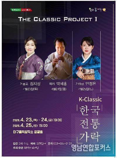 영남연합포커스 김종설 기자 | 대구 남구 대덕문화전당이 순수예술 활성화를 위해 지난해 신설한 ‘The Classic Project’의 2026년 상반기 시리즈가 세계적으로 각광받고 있는 국악의 매력을 소개하는 무대들로 오는 4월 23일부터 4월 25일까지 사흘간 대구음악창작소 창공홀에서 펼쳐진다.