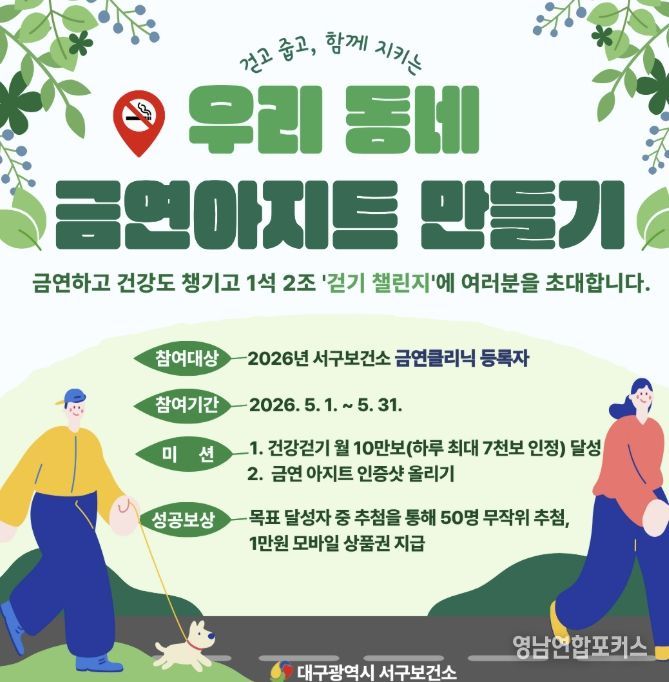 영남연합포커스 김종설 기자 | 대구 서구보건소는 금연 시도자들이 일상에서 즐겁게 목표를 달성할 수 있도록 금연 실천과 신체 활동을 결합한 ‘우리 동네 금연 아지트 만들기’ 챌린지를 오는 5월부터 10월까지 본격 운영한다고 밝혔다.