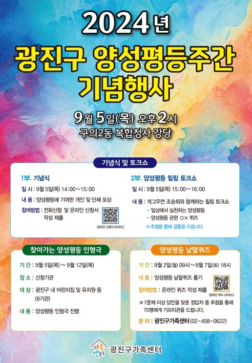 기념행사 참여를 희망하는 구민은 광진구가족센터(☎02-458-0622) 유선 또는 QR코드를 통해 온라인으로 신청하면 된다. 양성평등에 관심 있는 광진구민이면 누구나 무료로 신청할 수 있다.