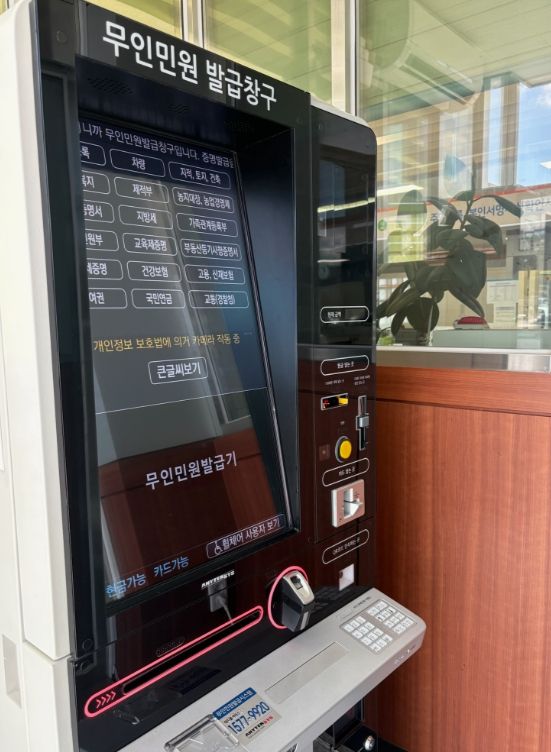 무인민원발급기를 이용하면 창구보다 최대 50%까지 저렴한 수수료로 서류를 발급할 수 있으며, 카드 결제도 가능하다.