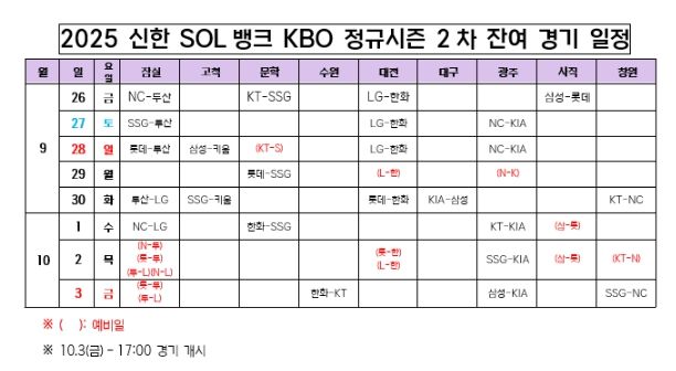 영남연합포커스 기자 | KBO는 26일(금) 2025 신한 SOL뱅크 KBO 정규시즌 2차 잔여 경기 일정을 확정했다.