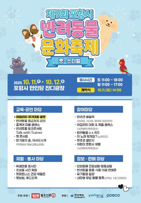 영남연합포커스 김진우 기자 | 포항시는 오는 10월 11일부터 12일까지 만인당 잔디광장에서 ‘제9회 포항시 반려동물 문화축제’를 개최한다.