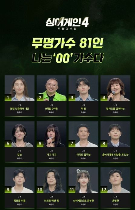 오는 10월 14일(화) 첫 방송되는 JTBC ‘싱어게인4-무명가수전’(기획 윤현준, 연출 위재혁/이하 ‘싱어게인4’) 측은 1일, 치열한 경쟁률을 뚫고 본선에 진출한 81인을 공개했다.