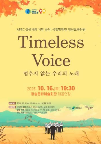 영남연합포커스 김진우 기자 | 청송군은 오는 16일 저녁 7시 30분, 청송문화예술회관 대공연장에서 APEC 성공개최를 기원하는 국립합창단 청년교육단원 공연 ‘Timeless Voice – 멈추지 않는 우리의 노래’를 개최한다.