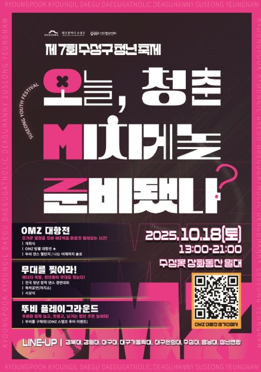 영남연합포커스 김종설 기자 | 대구 수성구는 오는 18일 수성못 상화동산 일대에서 ‘2025 제7회 수성구 청년축제’를 개최한다.