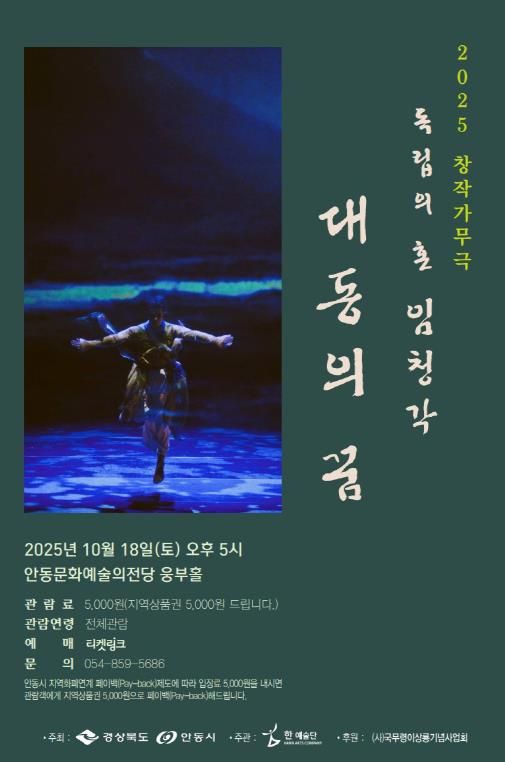 영남연합포커스 김진우 기자 | 한예술단이 주최․주관하는 '2025 창작가무극 독립의 혼 임청각 ‘대동의 꿈’' 공연이 10월 18일 오후 5시, 안동문화예술의전당 웅부홀에서 개최된다.