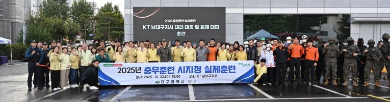 영남연합포커스 김종설 기자 | 대구 남구는 지난 22일, KT 남대구지사 주차장에서 테러범에 의한 인질극 발생을 가정한 인질 구출, 테러범 진압 훈련 및 드론 테러에 의한 화재발생 시 대피훈련, 화재진압, 복구 작업 등 테러·화재 대비를 주제로 한 『2025 충무훈련 실제훈련』을 실시했다.