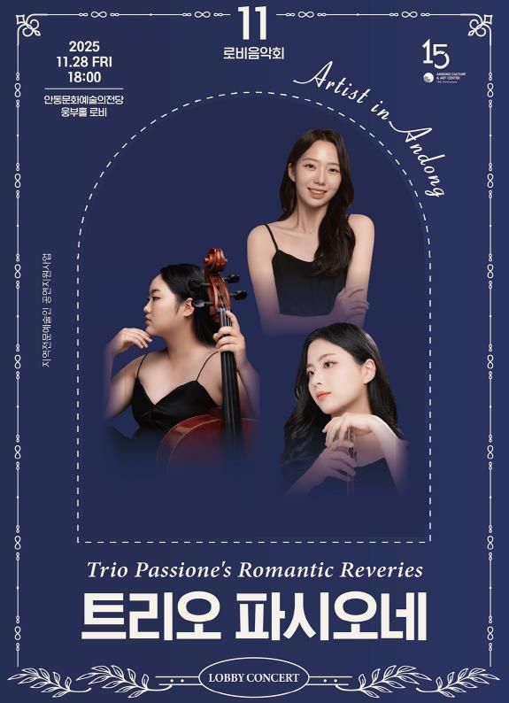 영남연합포커스 김진우 기자 | 안동문화예술의전당은 지역 문화예술 활성화와 전문 예술인의 역량 강화를 위해, 지역전문예술인 공연지원사업의 일환으로 로비음악회를 진행하고 있다. 오는 11월 28일 오후 6시, 웅부홀 로비에서 클래식 앙상블 Trio Passione(트리오 파시오네)의 공연이 열린다.