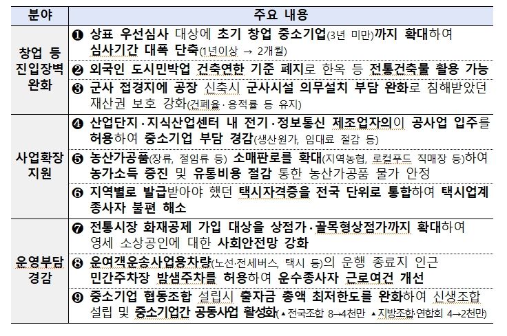 이번 방안은 경기 회복의 흐름이 민생현장의 지속가능한 성장과 도약으로 이어지도록, 중소기업과 소상공인이 사업운영 전반에서 체감하는 불합리한 규제애로를 선제적으로 개선하기 위해 마련됐다.