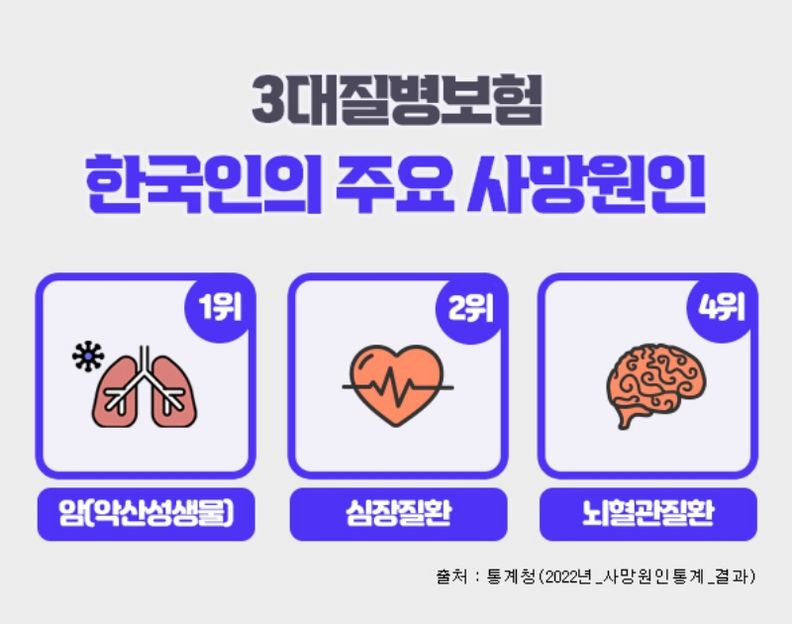 영남연합포커스 기자 | 흔히 3대질병이라 일컫는 암, 심혈관질환, 뇌혈관질환은 통계청 발표자료에 따르면 한국인의 주요 사망원인 중에서 3위 폐렴을 제외하고 1~4위를 차지하고 있으며, 이전부터 지금까지도 살면서 가장 먼저 대비해야 하는 치명적인 질병으로 강조되고 있다. 이러한 중대질병에 대비하기 위하여 상기 세가지 치명적인 질병을 집중보장하는 3대질병진단비보험을 많이 가입하고 있다. 3대진단비보험은 각각의 질병을 중점적으로 보장하면서도 가입자 특성에 맞는 특약을 추가함으로써 종합건강보험으로도 활용할 수가 있다.