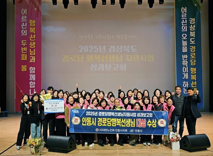 영남연합포커스 김진우 기자 | 안동시와 (사)대한노인회 안동시지회는 12월 18일, 경상북도가 경북도청 동락관에서 개최한 ‘경로당 행복선생님 지원사업 2025년도 성과보고회’에서, 도내 22개 수행기관을 대상으로 한 사업평가 결과 ‘대상’을 수상하는 영예를 안았다.