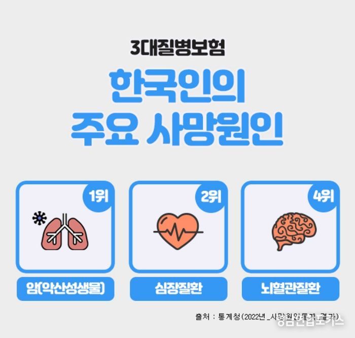 영남연합포커스 기자 | 3대질병으로 일컬어지는 암, 뇌혈관질환, 심혈관질환은 한국인의 주요 사망원인에서 상위를 차지하고 있으며, 이에 대한 진단비를 집중적으로 보장해 주는 보험상품을 3대질병진단비 보험이라 할 수 있다.