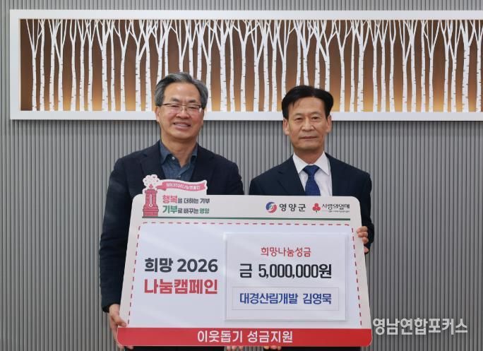 영남연합포커스 김진우 기자 | 대경산림개발 대표 김영묵(전 농업경제건설국장)은 1월 21일 영양군을 방문해 지역의 어려운 이웃과 희망을 나누고자 성금 500만원을 기부하며 '희망2026나눔캠페인'에 동참했다.