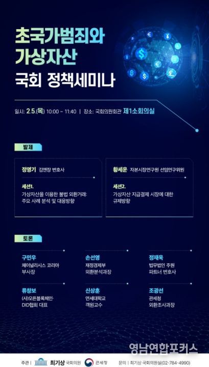 영남연합포커스 기자 | 관세청은 최기상 국회의원(더불어민주당·서울 금천구)과 공동으로 2월 5일 국회 의원회관에서 '초국가범죄와 가상자산: 국경을 넘어선 불법 자금 흐름 대응' 국회 정책 세미나를 개최했다.