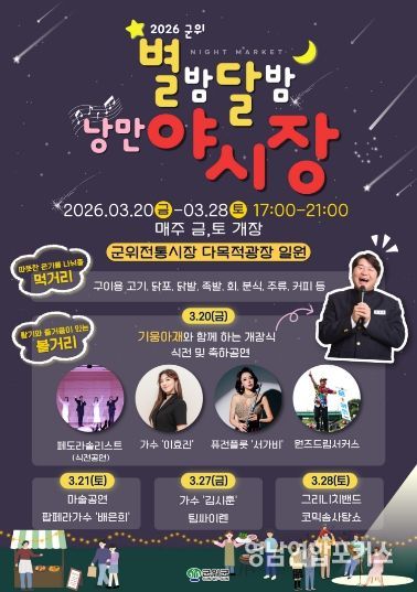 영남연합포커스 김진우 기자 | 군위군은 전통시장에 활력을 불어넣고 군민과 방문객들에게 봄밤의 추억을 선사하기 위해 '군위전통시장 별밤달밤 낭만 야시장'을 오는 3월 20일 개장해 3월 28일까지 매주 금요일과 토요일 운영한다고 밝혔다.