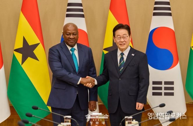 영남연합포커스 기자 | 이재명 대통령은 11일 오후 우리나라를 실무 방한한 존 드라마니 마하마 가나 대통령과 정상회담을 가졌다고 강유정 청와대 대변인이 서면 브리핑을 통해 밝혔다.