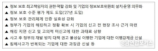 정보통신망법 개정안은 사이버 침해사고 예방부터 대응까지 전 범위를 강화하는 것을 골자로 한다. 기업의 정보 보호 역량을 높이고 관련 정보 보호 인증 체계를 강화하여 침해사고 발생을 더 효과적으로 예방할 수 있게 되며, 사고 발생이 의심되면 정부의 조사가 가능해져 사이버보안 침해사고에 더욱 빠르게 대응할 수 있게 된다. 무엇보다 침해사고로 인한 국민의 피해를 방지하기 위해서 기업의 사회적, 법적 책임을 강화하는 내용을 담고 있다.