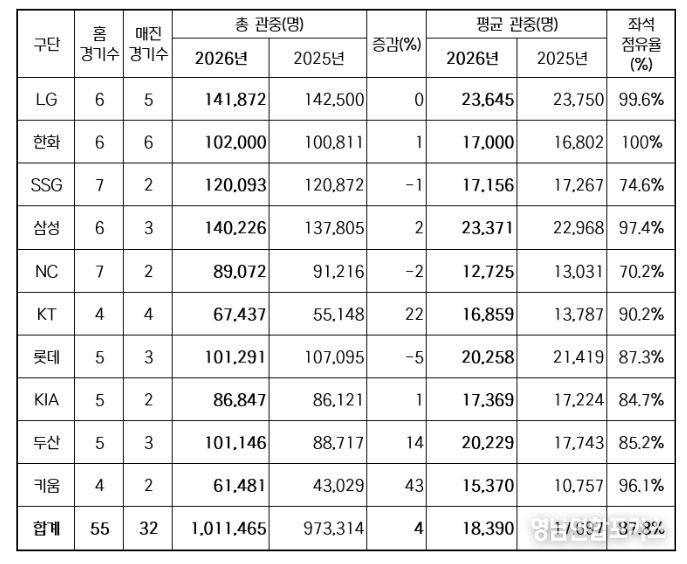 이로써 오늘 경기까지 누적 관중 101만 1,465명을 기록하며 역대 최소 경기인 55경기만에 100만 관중을 달성했다. 종전 기록은 2025시즌에 기록한 60경기다. 오늘 55경기만에 달성함에 따라 종전 기록을 5경기 앞당겼다.