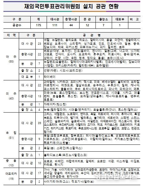 전쟁․폭동 등으로 인해 주재국 정세가 불안한 ▲주아프가니스탄이슬람공화국대사관 ▲주우크라이나대사관 ▲주레바논공화국대사관 ▲주리비아대사관 ▲주사우디아라비아왕국대사관 ▲주젯다총영사관 ▲주두바이총영사관 ▲주예멘공화국대사관 ▲주오만왕국대사관 ▲주이라크공화국대사관 ▲주이라크공화국아르빌분관 ▲주쿠웨이트국대사관 ▲주수단공화국대사관 등 13개 공관에는 재외국민투표관리위원회를 설치하지 않는다.