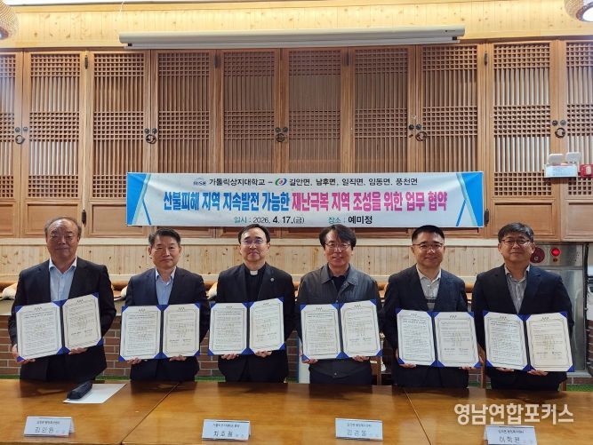 이번 협약은 경상북도가 주관하는 지역혁신중심 대학지원체계(RISE) 사업에 선정된 데 따른 것으로, 가톨릭상지대학교는 오는 2029년까지 5년간 총 25억 원의 사업비를 투입해 산불 피해지역 주민을 대상으로 ‘대학동행 산지 대전환’ 과제를 수행하게 된다.
