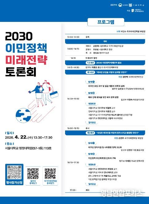 영남연합포커스 기자 | 법무부는 2026년 4월 22일 오후 2시 서울대학교 행정대학원에서 서울대학교(총장 유홍림)와 공동으로'2030 이민정책 미래전략'토론회를 개최했다.