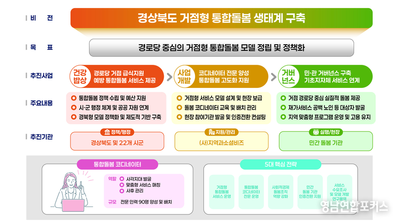 주요 사업으로 ①경로당 중심 어르신 밥상지원 ②통합돌봄 서비스 개발 ③돌봄코디네이터 양성․운영 ④경북형 통합돌봄 거버넌스 구축으로 의료·돌봄·주거관리, 안전, 이동관리 등 어르신 삶 전반을 아우르는 통합돌봄 패키지를 지원한다.
