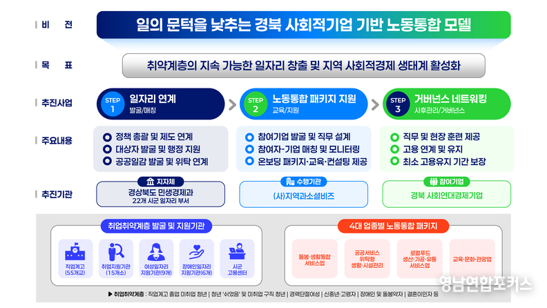 이번 사업은 사회연대경제기업을 중심으로 돌봄과 일자리를 함께 해결하는 지역 구조를 만들고, 이를 통해 사회적 가치가 선순환하는 지속 가능한 “경북형 지역 생태계” 구축을 목표로 추진한다.