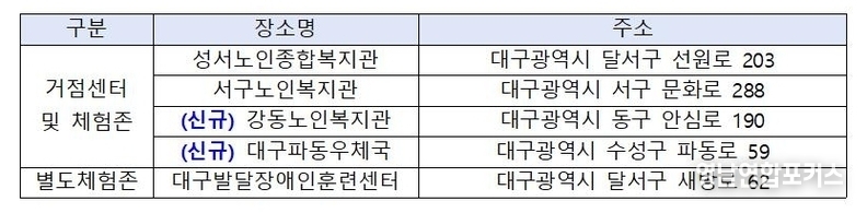 이를 위해 ▲성서노인종합복지관 ▲서구노인복지관 ▲강동노인복지관 ▲대구파동우체국 등 4개 거점센터를 평일에 상시 운영하고, ▲대구발달장애인훈련센터에는 별도의 체험존을 운영한다.