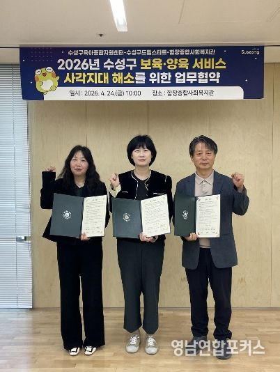 영남연합포커스 김종설 기자 | 대구 수성구육아종합지원센터(센터장 심영숙)는 지난 24일 수성구 드림스타트센터(센터장 김은미), 함장종합사회복지관(관장 권혁철)과 지역 내 보육·양육 서비스 사각지대 해소를 위한 ‘3자 업무협약(MOU)’을 체결했다고 밝혔다.