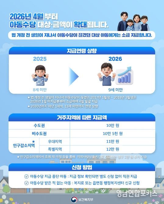 영남연합포커스 기자 | 2026년 4월부터 아동수당 대상·금액이 확대됩니다.