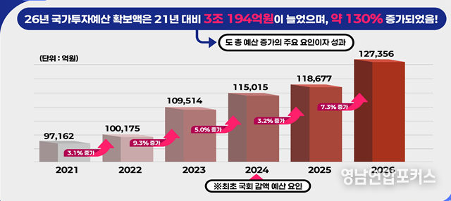 또한, 지난해보다 국비 확보 대응 체계와 활동 점검을 대폭 강화한 결과 실국별 건의 사업 건수와 금액, 규모가 모두 증가해 역대 최대 규모인 2027년 국비 13조원 돌파에 대한 기대가 커지고 있다.
