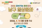 영남연합포커스 김종설 기자 | 대구 남구는 지역 주민들에게 일상 속 문화 향유 기회를 확대하고, 지역 예술가들의 공연 활동을 지원하기 위해 ‘2026 찾아가는 문화공연’ 을 개최한다. 관내 신규 입주 공동주택을 대상으로 공연을 희망하는 아파트 단지를 선정하였으며, 오는 4월 14일(화) 앞산비스타동원 아파트에서 첫 공연을 진행할 예정이다. 저녁 7시에 열리는 ‘앞산비스타동원 음악회’에서는 인기 개그맨 김재롱이 사회를 맡고, 지역 가수 이새벽과 미스트롯 4 출연자 장혜리 가수가 공연을 펼친다. 또한, 아파트 입주 후 처음으로 열리는 주민 참여 행사인만큼 입주자 대표회에서도 다양한 경품과 선물을 준비하여 주민 화합의 장을 만들 예정이다. 조재구 남구청장은 “대규모 축제나 행사도 중요하지만, 주민들이 사는 가까운 동네에서 편하게 문화예술을 접할 수 있도록 찾아가는 문화행정을 적극 추진하겠다.”라며, “아파트로 찾아가는 음악회를 통해 주민들이 일상에서 소소한 행복을 느끼며 힐링할 수 있기를 바란다.”라고 전했다. ‘찾아가는 문화공연’에 대한 문의는 남구 문화관광과 문화예술팀으로 연락하면 안내받을 수 있다.