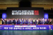 영남연합포커스 김진우 기자 | 경주시가 2025년 APEC 정상회의 개막을 한 달 앞두고 시민의 힘을 하나로 모아 성공개최 의지를 다졌다. 시는 30일 경주실내체육관에서 ‘2025년 APEC 정상회의 성공개최 범시민실천결의대회’를 성황리에 개최했다고 밝혔다. 이번 행사에는 APEC 범시도민지원협의회(공동회장 박몽룡·이상걸) 소속 회원을 비롯해 유관기관, 시민단체, 자원봉사자 등 경주시민 3천여 명이 참석해 시민과 함께하는 APEC의 진정한 의미를 되새겼다. 특히 주낙영 경주시장을 비롯해 김석기 국회 외교통일위원장, 이동협 경주시의장, 최병준 경북도의회 부의장을 비롯해 시·도의원 전원이 참석해 시민과 함께 손님맞이 실천 결의를 다지고 성공 개최를 향한 열기를 더했다. 행사장 내부에는 시민단체들이 자체 제작한 손님맞이 실천 결의 현수막이 곳곳에 걸려 있어, APEC 성공개최를 향한 시민들의 뜨거운 참여 의지를 생생하게 보여주었다. 본행사에 앞서 참석자들은 ‘APEC 시민 10대 실천과제’를 함께 되새기며, 모든 시민이 APEC의 주인으로서 행동할 때 성숙한 시민의식과 지속가능한 경주를 만들