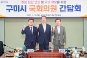 영남연합포커스 김진우 기자 | 구미시는 9월 30일 국회를 방문해 구자근, 강명구 지역구 국회의원과 간담회를 열고 지역 주요 현안과 국비 확보 전략을 논의했다. 이날 간담회에는 김장호 시장을 비롯해 구미시 주요 간부 공무원 등 30여 명이 참석했다. 시는 현안 사업 추진 상황과 정부 예산 동향을 공유하며 국회 차원의 전략적 지원 방안을 모색했다. 주요 현안사업으로는 △구미국가산업단지 1~3단지 연결교량 신설 △구미~신공항 철도건설 △대한민국역사박물관(구미산업화역사관) 건립 △새마을운동중앙회 및 연수원 유치 △'5극 3특'국가균형성장 전략 대응 △한국은행 구미지역본부 유치 △'방위산업 소재ㆍ부품ㆍ장비 특화단지'유치 △국가 푸드테크 클러스터 조성 등이 논의됐다. 주요 국비사업으로 △구미시 제조창업 인큐베이팅 센터 구축 △AX 실증산단 구축 사업 △지역 주력 중소기업형 인공지능 데이터 스페이스 구축 △차세대 디스플레이 핵심부품ㆍ소재 기술개발 △반도체 장비 챔버용 소재부품 제조 및 검증 테스트베드 구축 △수요확대형 배터리 테스트베드 구축 △구미 산동 국민체육센터 조성 △푸드테크 연구지원센터 구축 △펫테크 산업화 지원센터 구축 △4
